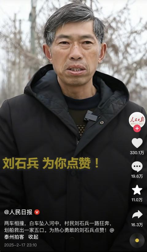 2025年2月11日清晨,泰州市醫藥高新區(高港區)胡莊鎮劉蕩村村民劉石兵躍入冰冷河水,成功救起五名落水者。現場視頻經傳播后,在泰州本地社交平臺引發廣泛關注。2月17日,《人民日報》抖音號轉載該視頻,收獲超330萬點贊,“泰州大叔”的英勇形象破圈傳播。8月27日,2025年第二次“中國好人榜”發布,劉石兵入選“見義勇為”類身邊好人。