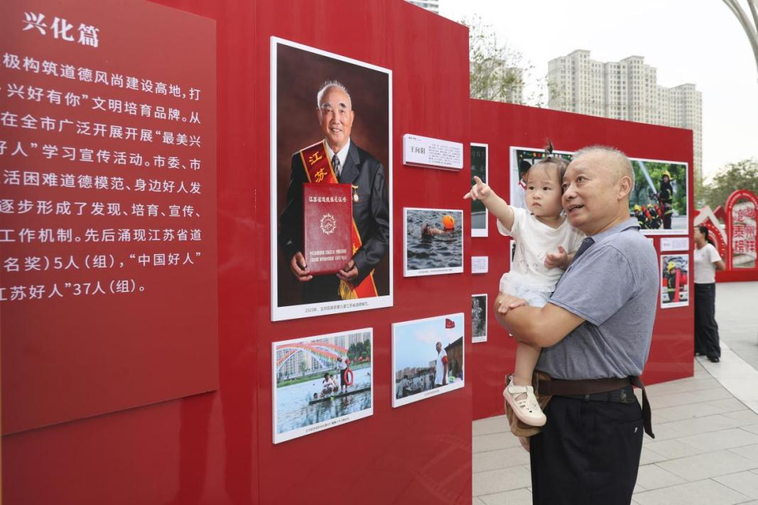 市民帶孩子在“追光·泰州榜樣”攝影展興化篇展區,駐足了解道德模范事跡,傳遞榜樣力量