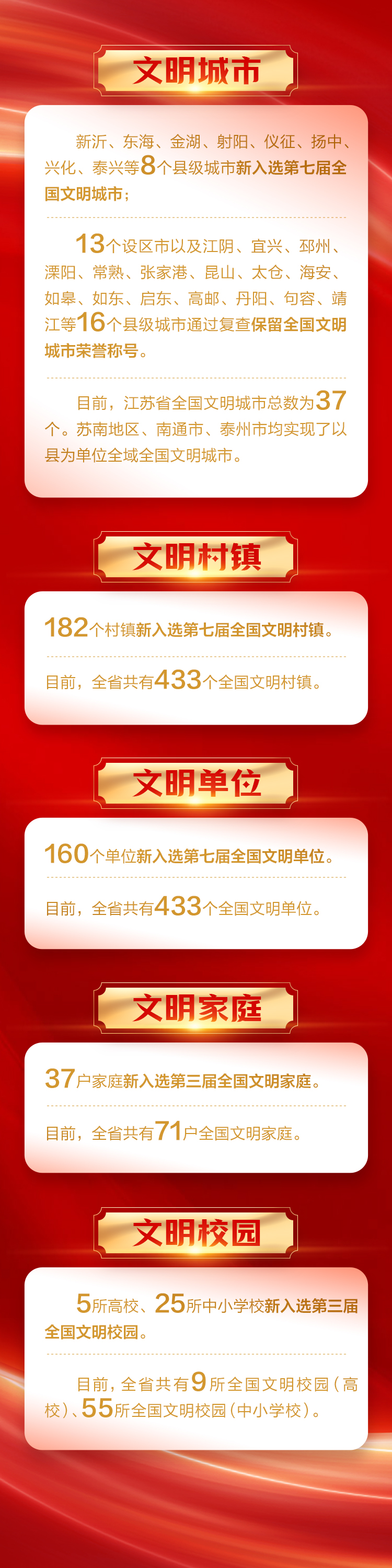 新沂、東海、金湖、射陽、儀征、揚中、興化、泰興等8個縣級城市新入選第七屆全國文明城市,13個設區市、16個縣級城市通過復查保留全國文明城市榮譽稱號,蘇南地區、南通市、泰州市均實現了以縣為單位全域全國文明城市。我省182個村鎮、160個單位新入選第七屆全國文明村鎮、文明單位,37戶家庭、30所學校新入選第三屆全國文明家庭、文明校園,251個村鎮、273個單位、34戶家庭、34所學校通過復查確認繼續保留全國文明村鎮、文明單位、文明家庭、文明校園榮譽稱號。