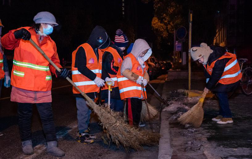 凌晨五點,當薄雪籠罩的南京尚未蘇醒時,“城市美容師”們不俱寒冷,在刺骨的寒風里穿梭勞動,“寧愿一人臟,換來萬家凈”。另一邊燈火昏明的室內(nèi),小志愿者們第一次見到凌晨五點的南京,他們冒著刺骨的寒風,走出家門,親眼見證一直以來他們覺得時刻干凈清爽的街道背后原來是環(huán)衛(wèi)工人們頂著寒風默默辛勤勞作的成果。
