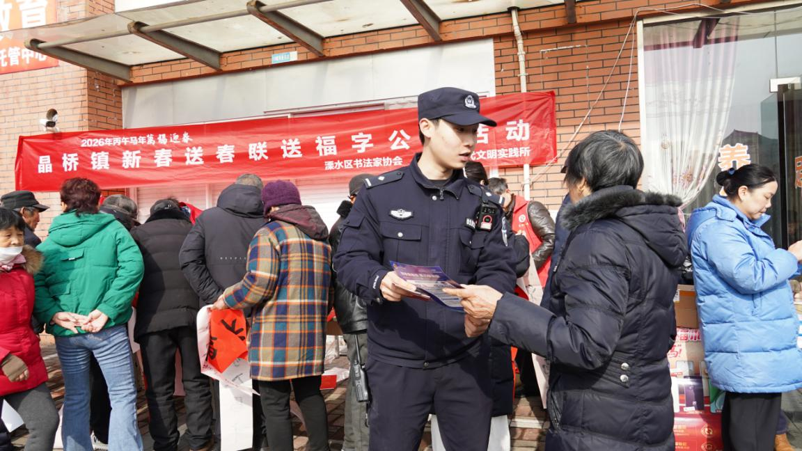 活動不僅送文化,更送服務、送安全?,F場,晶橋派出所的民警們利用村民排隊等候的間隙,發放反詐宣傳手冊,結合真實案例講解防范電信詐騙的知識,提醒大家守好“錢袋子”。書法家們還特別創作了一批弘揚見義勇為精神的特色春聯,如“見義勇為弘美德,崇德尚義護民生”等,這些作品將張貼在村社黨群服務中心、文化廣場等公共場所,傳播社會正能量。身著紅馬甲的志愿者們則忙碌地引導秩序、協助晾曬、幫忙包裝,并為行動不便的老人提供上門送聯服務,讓惠民活動既有文化厚度,更有服務溫度。