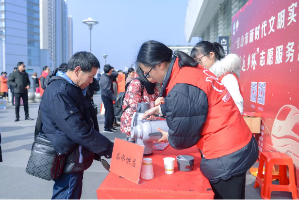 很多旅客為了不錯過回家的車,早早地就來到車站外等候。天氣寒冷,考慮到候車室外沒有熱水供應,此次活動特意為他們提供了茶水供應服務。春運是車站最為繁忙的時候,工作人員為了大家的團圓幸福付出了很多。在溫暖返鄉旅客的同時,志愿者不忘溫暖這些室外辛勤的勞動者,給他們送水送問候。