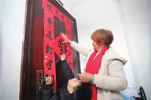 2月1日,姑蘇區(qū)金閶新城白洋灣街道寶鄰社區(qū)的羅成長、李聲珠和孫子在租住地家中掛燈籠、貼對聯(lián),布置過年氛圍。羅成長一家來自福建,今年他們響應(yīng)號召,決定留在蘇州。圖為奶奶李聲珠帶著孫子貼對聯(lián)。□記者張健攝