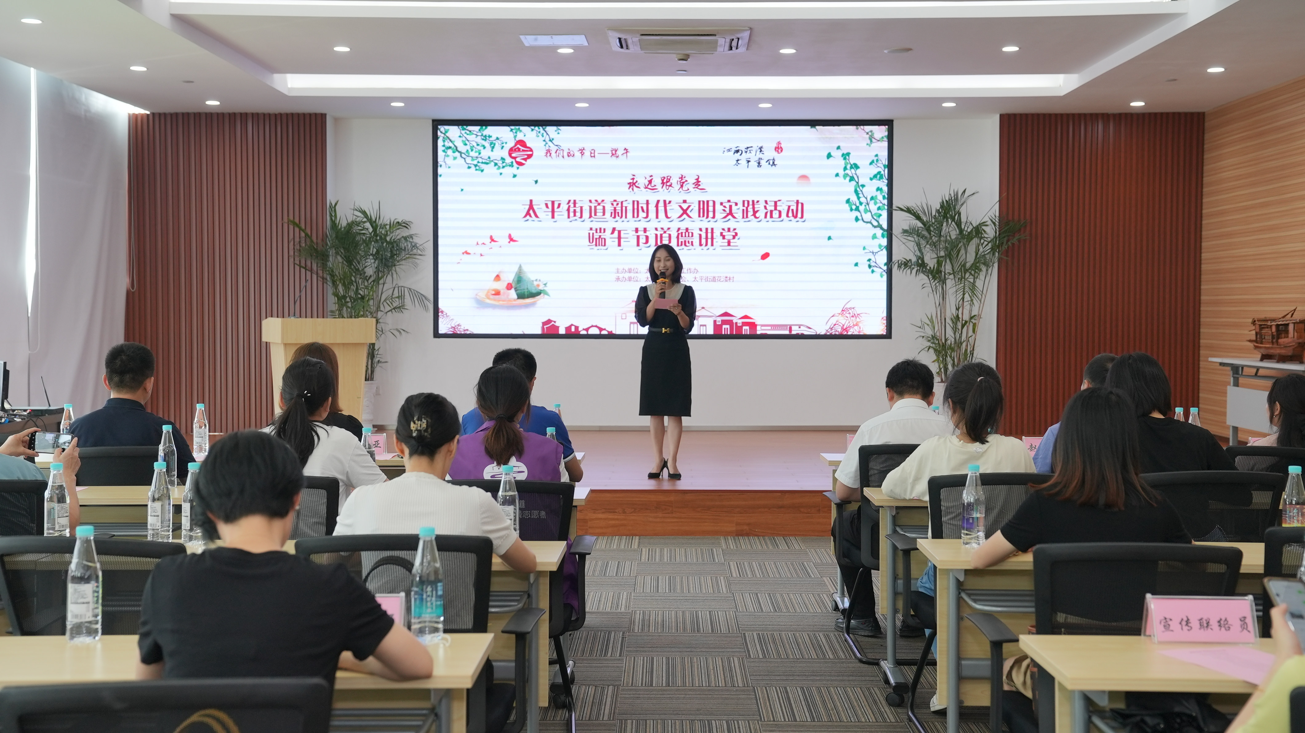 講好“傳統文化” 為進一步弘揚傳統文化,在端午節來臨之際,太平街道特舉辦端午節主題道德講堂,加深各單位之間的感情,增加愛國情感,共樹文明新風。在“談感悟”環節,在場人員分享了自己對端午傳統文化的認識和屬于自己的“端午故事”,在活動“送吉祥”環節,志愿者們給每一位參與者分發了具有端午節文化特色的祝福小禮品,引導大家進一步了解傳統節日、認同傳統節日、喜愛傳統節日、過好傳統節日,讓傳統文化代代相傳。