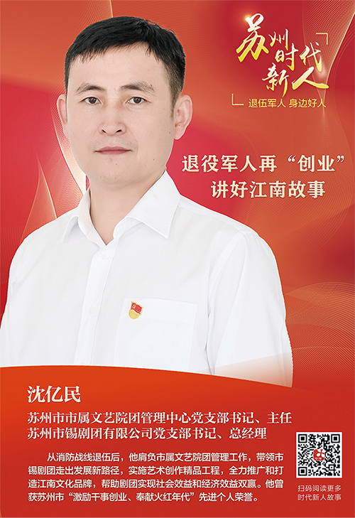 身為一名退伍軍人,蘇州市市屬文藝院團(tuán)管理中心主任兼蘇州市錫劇團(tuán)有限公司總經(jīng)理沈億民扛起傳統(tǒng)文藝院團(tuán)轉(zhuǎn)型發(fā)展的重任,推動(dòng)市錫劇團(tuán)建立現(xiàn)代化企業(yè)管理的劇團(tuán)模式,帶領(lǐng)劇團(tuán)走出自己的發(fā)展路徑,創(chuàng)排精品新戲、傳播江南文化,實(shí)現(xiàn)社會(huì)效益和經(jīng)濟(jì)效益的雙贏。