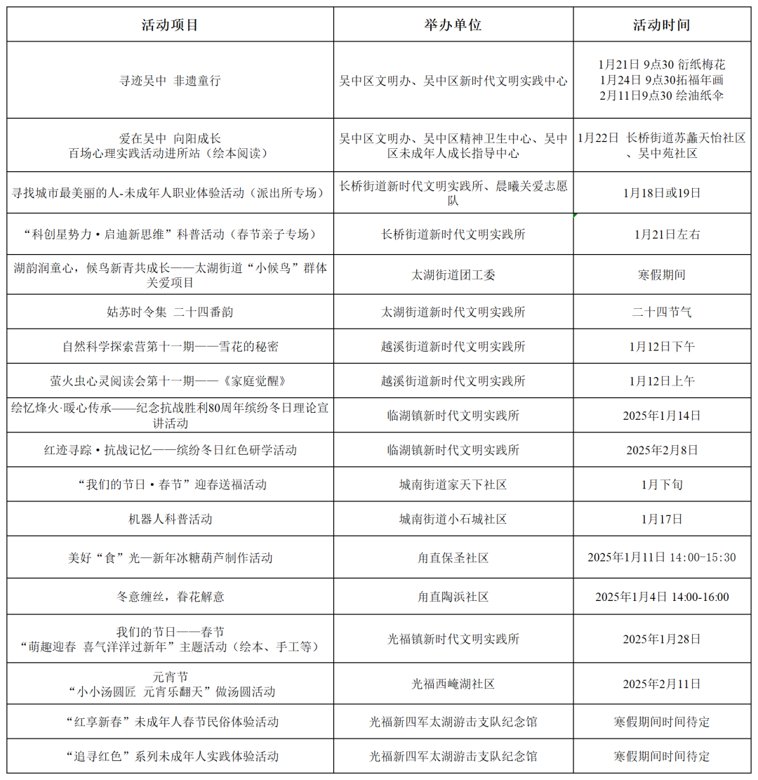 蘇州市的大小可愛們,期待已久的寒假即將到來,你打算如何度過這個假期呢?蘇州市2025“繽紛的冬日”未成年人系列活動來啦,今年,我市結合心理健康、勞動教育、傳統(tǒng)文化、關愛幫扶