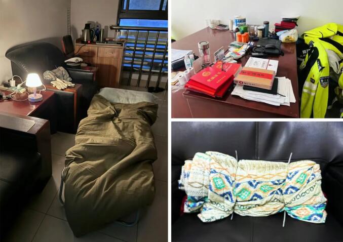 許允若的辦公室凌亂得有點過分,桌上滿是書籍材料紙張,還有一摞摞病歷和醫院配的藥。椅背上掛滿了制服,一層一層,看得出這些衣服陪著許允若走過的春夏秋冬。桌邊的開水壺里還熬著中藥,燈亮著。一張行軍床就放在辦公室,一盞聲控小臺燈放在茶幾上。茶幾邊的硬木沙發上,一個折疊成小方塊的床單用塑料束帶綁著,這是許允若自制的靠墊,據說這個靠墊能讓他坐著時稍微舒服點,他有很嚴重的腰椎間盤突出癥。他白腰帶的毛粘已被磨得光滑發亮,同樣的腰帶隊里每年都會配發,他一直沒有換,是因為這條腰帶經過了他的手動改造,在最中間的位置縫了一個大約寬5厘米的“揪兒”。這樣,如果把腰帶拉到最緊,這個縫合的凸起部分恰好能給腰肌一點兒支撐。他還有胃病、支氣管炎、高血壓、肺結節,桌上壘著好幾本厚厚的病歷卡,柜子里滿滿當當的各類藥品,看得出他的病痛不輕松。他每天要吃十幾種藥,還自己熬些中藥,同事們都知道他是個“藥罐子”。但是,除了吃藥,身邊的人絲毫沒覺得他是個病人,他甚至是那個最能加班加點的人。