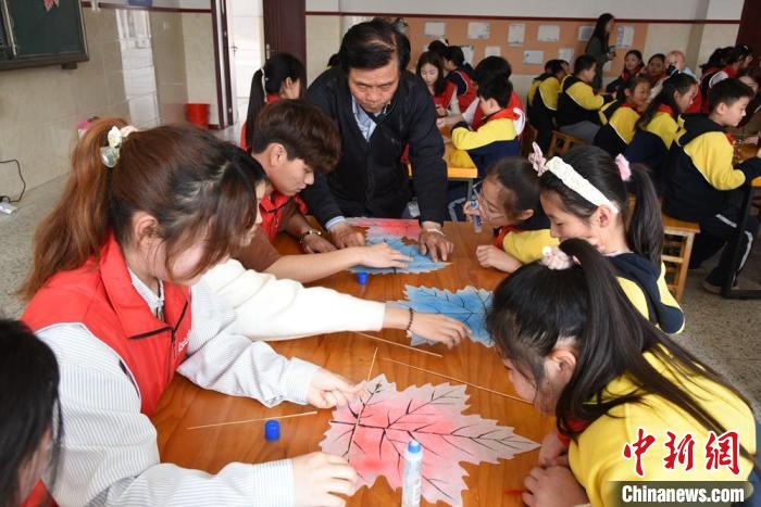 “把紙質楓葉沿著中縫對稱折疊,然后將最上面的葉尖沿著梗線橫向折疊……”北辰小學一間教室里,市級非遺項目“徐州風箏”代表性傳承人曹開君現場教學生們制作風箏。來自江蘇建筑職業技術學院的30余名大學生志愿者與北辰小學的30余名學生,結對協作,一起學習風箏制作。