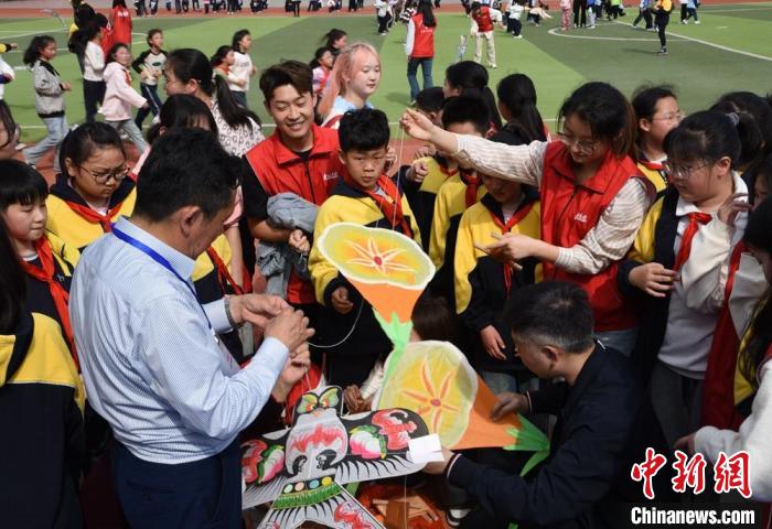大學生和小學生爭相挑選風箏,放飛風箏。朱志庚 攝