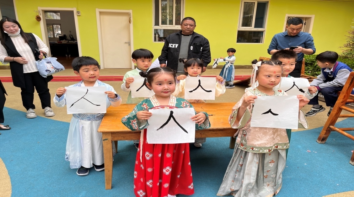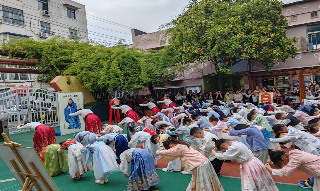 本次活動共分為自正衣冠、敬拜師長、朱砂啟智、誦讀經典、擊鼓鳴志、開筆啟蒙六個環節。活動中,幼兒園的老師和社區志愿者詳細地給孩子們介紹了漢代服飾、漢代禮儀及漢文化傳統,并帶領孩子們體驗了漢服的穿戴,體驗了立容、坐容、作揖等傳統禮儀文化,一起吟誦了《弟子規》。
