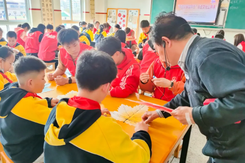 “把紙質楓葉沿著中縫對稱折疊,然后將最上面的葉尖沿著梗線橫向折疊……”北辰小學一間教室里,市級非遺項目“徐州風箏”代表性傳承人曹開君現場教學生們制作風箏。來自江蘇建筑職業技術學院的30余名大學生志愿者與北辰小學的30余名學生,結對協作,一起學習風箏制作。