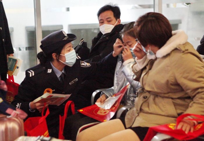 近日,南京鐵路公安處常州站派出所民警與常州北站工作人員在常州北站舉行“溫暖春運路,鐵警伴你行”主題活動。民警在候車大廳設(shè)了旅途安全咨詢宣傳臺,對旅客開展安全和防疫宣傳。圖為民警為沒有佩戴口罩的小朋友佩戴口罩。(常州日報 徐蘊涵 史康 汪磊圖文報道)