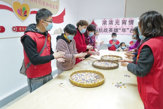 近日,常州市經開區戚墅堰街道花溪社區組織轄區青少年開展“濃濃元宵情 我與抗戰英雄‘年’在一起”活動。社區活動室一派熱鬧景象,隨著一雙雙巧手的搓轉,一枚枚五彩晶瑩的元宵很快就擺滿了竹匾。志愿者還為社區老人送去湯圓、點心、水果等愛心物品,與他們共慶元宵佳節。(蔣雯 攝)
