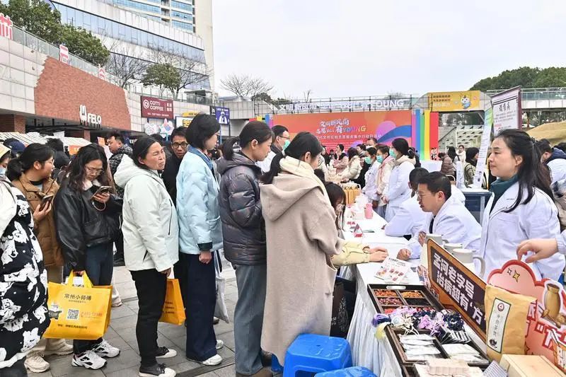 現場設置的“志愿‘BEI’有YOUNG”文明集市人氣超高。一批優秀志愿服務組織、品牌和項目進行了展示,政策咨詢、健康義診、勞動維權等便民服務以及文創產品展示、新品推介等吸引了園區青年和周邊市民。