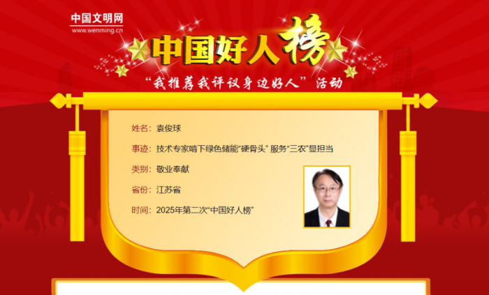 近日,2025年第二次“中國好人榜”發布儀式暨全國道德模范與身邊好人現場交流活動在黑龍江省伊春市舉辦。常州市某電力有限公司三級專家袁俊球當選敬業奉獻類“中國好人”。
