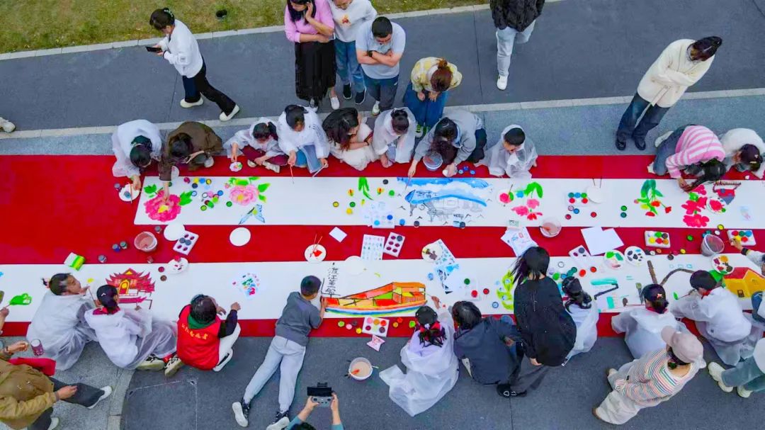 在夏和興雕塑藝術館門口,青年朋友們帶著孩子在長約25米的畫布上盡情潑墨,將家鄉最美的模樣留在了畫卷上。經過大家的協力創作,興國塔、中山公園、飛馬水城、百花園等江陰景點躍然紙上、栩栩如生。