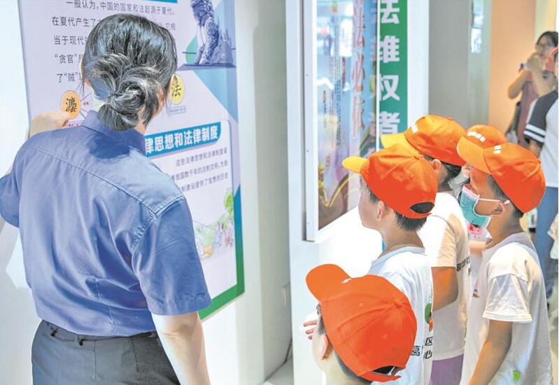 無錫市濱湖區人民檢察院第三檢察部檢察官助理勇紫妍介紹,“濱湖區青少年法治教育實踐基地”集普法宣傳、沉浸式體驗、心理輔導于一體,基地重點圍繞未成年人的“六大保護”,將法律和圖文、多媒體設備相結合,讓青少年們看得見、聽得懂,深入學習法律知識。(殷婉婷/文 實習生 唐恩/攝)