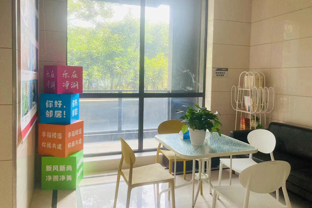 “顏值”提升,“幸?!鄙?。今年8月底開始,凈湖社區(qū)聯(lián)合物業(yè),對樓道墻面、樓梯吊頂進(jìn)行了全面粉刷、維修,清除雜物、整治環(huán)境。結(jié)合居民需求和樓道主題,設(shè)置了便民服務(wù)柜、英雄模范宣傳墻、紅色閱讀書架、信息公示欄,并配備了桌椅。整個樓道煥然一新,干凈明亮、整潔溫馨。
