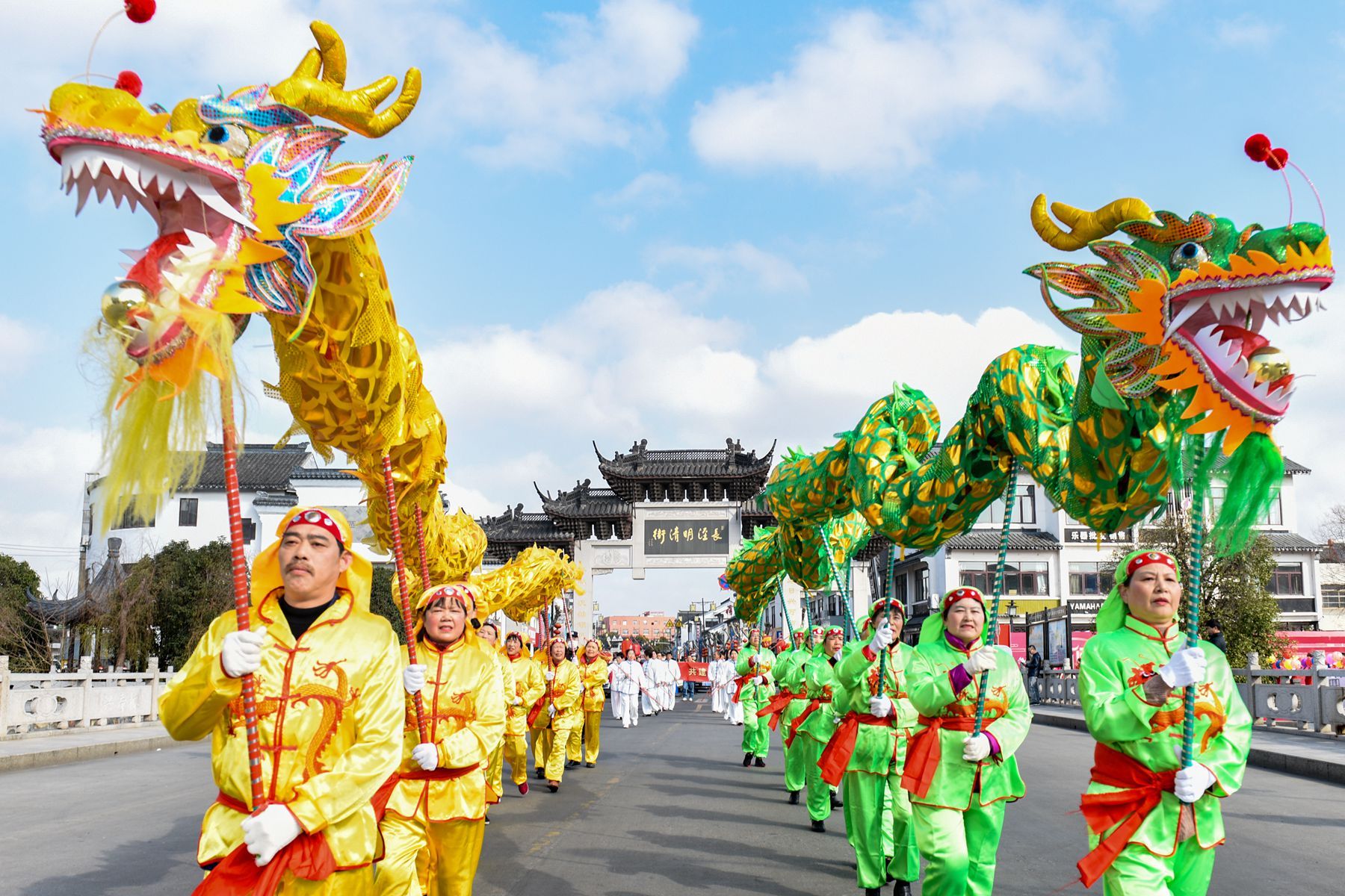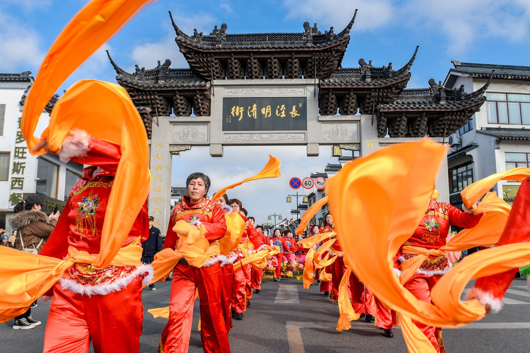 由歡樂腰鼓隊、喜慶鑼鼓隊、雙龍騰飛隊、紅燈高照隊、錫劇隊、秧歌隊、東舜蓮韻隊、娃娃樂隊、花籃隊、蚌殼龍船隊組成的長涇鎮民俗文化大巡游隊伍,沿著老街一路巡游,展示長涇特色民俗文化。現場鑼鼓喧天,載歌載舞的巡游長龍吸引了眾多居民跟隨觀看。