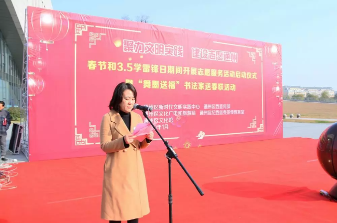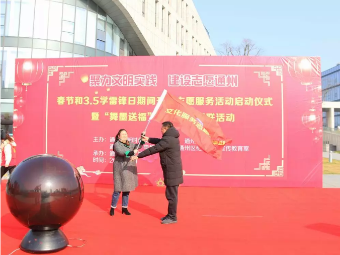 1月19日上午,通州區文博中心南廣場喜氣洋洋,熱鬧非凡。區新時代文明實踐中心與文廣旅局主辦的春節和3.5學雷鋒日期間開展志愿服務活動啟動儀式暨“舞墨送福”書法家送春聯活動正如火如荼地舉行。區文明辦副主任進行了活動致辭,文廣旅局分管領導向文化志愿者書法家代表授“春節和3.5學雷鋒日期間開展志愿服務”先鋒隊隊旗,全體志愿者代表一起宣讀了志愿者誓詞。