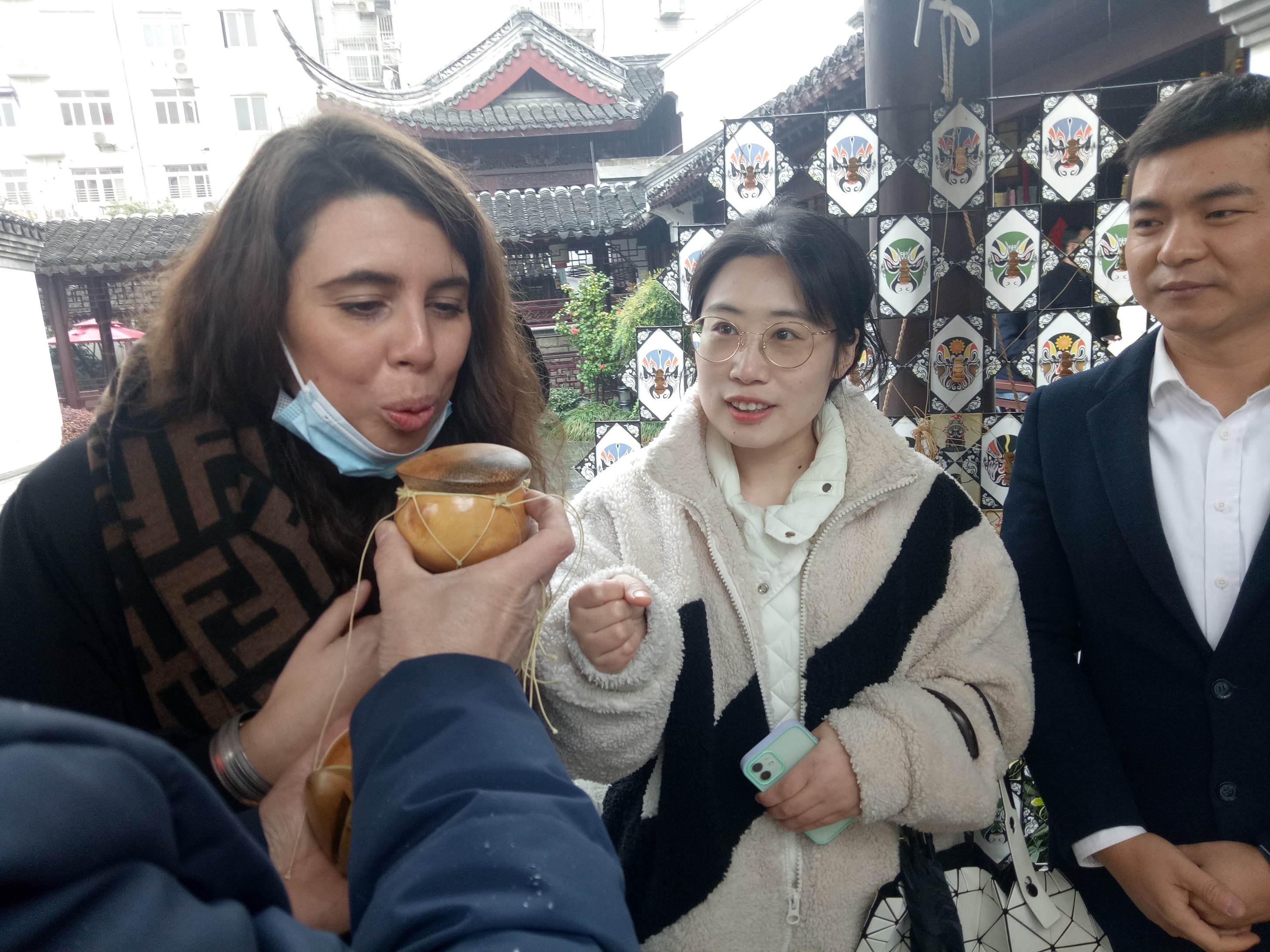 在專業講解員帶領下,外國友人們沿著庭廊參觀了板鷂風箏、面塑、糖畫、棕編、剪紙、香袋等一系列南通非遺文化手工藝品。“嗖嗖嗖……”板鷂風箏傳承人姚春華正用手機錄音向外國友人展示板鷂風箏的獨特聲音。風吹有聲,如箏鳴響,這種起源于北宋年間的南通傳統手工藝品吸引了不少外國友人。聽聞這種風箏被稱為“會唱歌的風箏”,來自意大利的南通大學藝術學院意大利語老師周佳(中文名)直呼:“很棒!很開心!”在剪紙藝人李海烽的展示區,外國友人見識了他的新作品新春生肖圖,千年文化、折疊的紅影和鏤空情思凝固在方寸之間,讓外國朋友駐足仔細觀賞,時不時嘖嘖贊嘆。