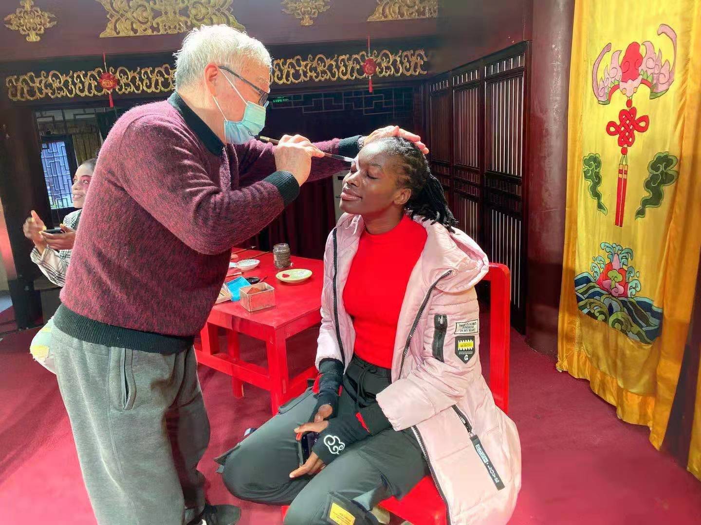 “孫悟空!他有大本領!”離開庭廊,在伶工學社的“百姓戲臺”上,來自安哥拉的學生孔諾正用并不標準的漢語,嬉笑著說起自己臉上畫著的臉譜。作為本次交流活動的一部分,外國友人除了現場品味“國粹”京劇,還有兩位學生上臺體驗了一把當“角兒”的感覺,另一位來自納米比亞的南通職大學生則穿起戲服,演起“花旦”。南通伶工學社是具有百年歷史的中國第一所新型戲曲學校,現場,梅派傳人、伶工學社負責人韋紅玉教部分外國友人學京劇動作、畫臉譜,讓外國友人體驗中國國粹文化的魅力。