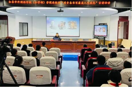 如皋市外國語學校(小學部)邀請中國好人李百戰給孩子們講述平凡卻有著最美底色的從警人生,鼓勵孩子們努力成為勞模精神的踐行者、傳承者、傳播者。