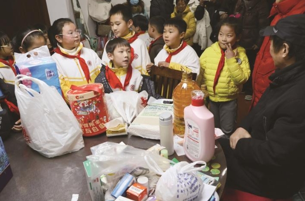 “孩子們快進來,謝謝你們來看我……”市民陳琴接過孩子們遞來的食用油、雞蛋等日用品,不禁紅了眼眶。陳琴今年70歲,因頸椎、腰椎等疾病,導致不能久站,日常起居都顯得格外艱難。令陳琴更傷心的是,前年丈夫的離世,讓她失去了陪伴、照顧自己的愛人,她的生活又遭到了沉重一擊。
