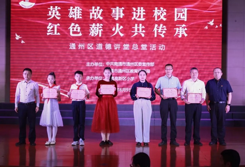 為弘揚偉大抗戰精神,6月5日下午,由南通市通州區委宣傳部、區文明辦、區教體局主辦,南通高新區小學承辦的“英雄故事進校園 紅色薪火共傳承”通州區道德講堂總堂活動在南通高新區小學舉行。南通高新區小學部分教師及五年級學生齊聚一堂,聆聽英雄故事,汲取奮進力量。區委宣傳部副部長、區文明辦主任吳志祥,區教體局黨組副書記、區政府教育督導室專職副主任葛青松參加活動。