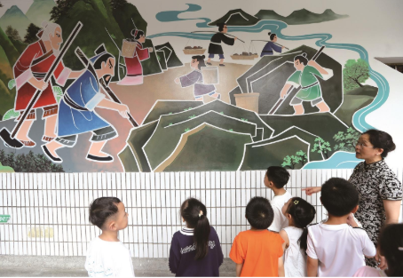 這4幅墻繪作品位于教學樓一樓、二樓、三樓,其中《愚公移山》《精衛填海》《后羿射日》3幅作品還原傳統神話經典場景,將堅持不懈、無畏抗爭的中華優秀傳統文化精神融入校園環境;另一幅航空航天主題作品傳遞出探索未知、追逐科技夢想的正能量。