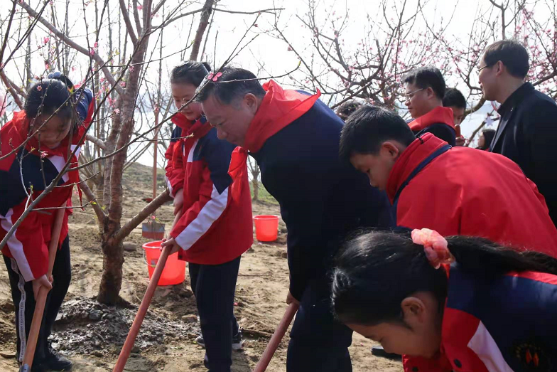 “讓我們一起為地球添綠吧!”王榮貴和孩子們拿起鐵鍬,挖坑、扶正、培土、澆水……不一會兒,香樟,櫸樹,樸樹,桂花,紫荊、桃樹并施施然于春風(fēng)里。綠葉映襯著孩子們的笑臉,春天更美了。王榮貴和孩子們拉著家常、有說有笑,與孩子們親切互動,構(gòu)成了這個春日里最溫暖的畫卷。