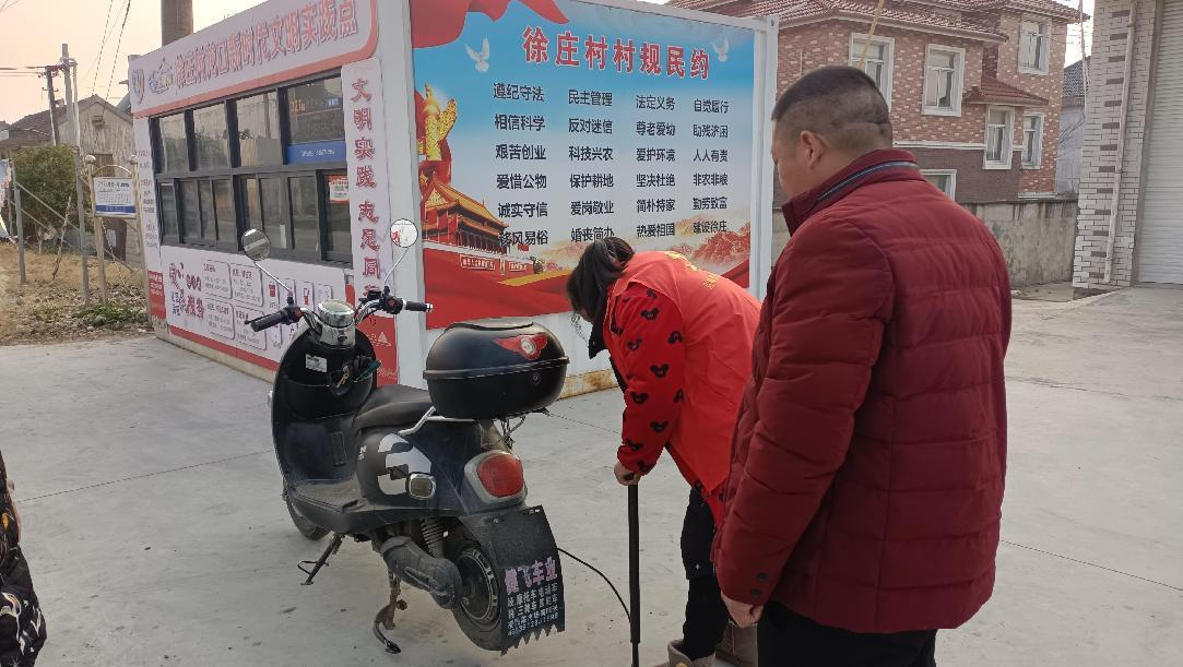 徐莊村文明實(shí)踐點(diǎn)中除了修車工具外還有雨傘、藥箱,等其他便民工具,為村民生產(chǎn)生活帶來(lái)便利。2024年3月4日早上,徐莊村村民陳師傅在日常騎電動(dòng)車上班中,車胎突兀地發(fā)出刺耳的摩擦聲,電動(dòng)車搖擺了兩下后陷入了“癱瘓”,這可急壞了要趕去上班的陳師傅。路邊聽(tīng)到聲響的村志愿者,立馬招呼他并幫他推車到最近的文明實(shí)踐點(diǎn)拿取修車工具。經(jīng)過(guò)一番換胎打氣后,電動(dòng)車重新煥發(fā)生機(jī),愁容也在陳師傅臉上轉(zhuǎn)為笑容。