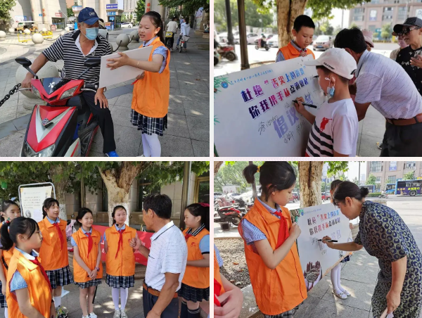 師專一附小鹽河校區開學前組織“光盤行動”進社區活動,少先隊員們用廣泛的宣傳積極號召全體市民厲行節約、反對浪費并在承諾墻簽上自己的名字。炎熱的天氣抵擋不住隊員們的熱情,一聲聲稚嫩的呼喚讓行人紛紛駐足并留下簽名。