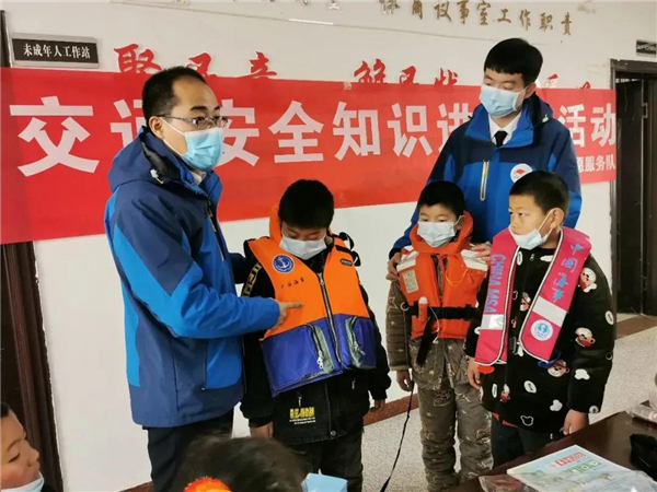“七彩海事”志愿者們則專門為留守兒童上了一堂水上交通安全知識課,講解了乘船注意事項、防溺水常識及海洋、航海知識,發(fā)放了《小學生水上交通安全教育讀本》,并現(xiàn)場演示了救生衣、救生圈等安全設(shè)備的穿戴使用方法,為他們的安全成長撐起“保護傘”。