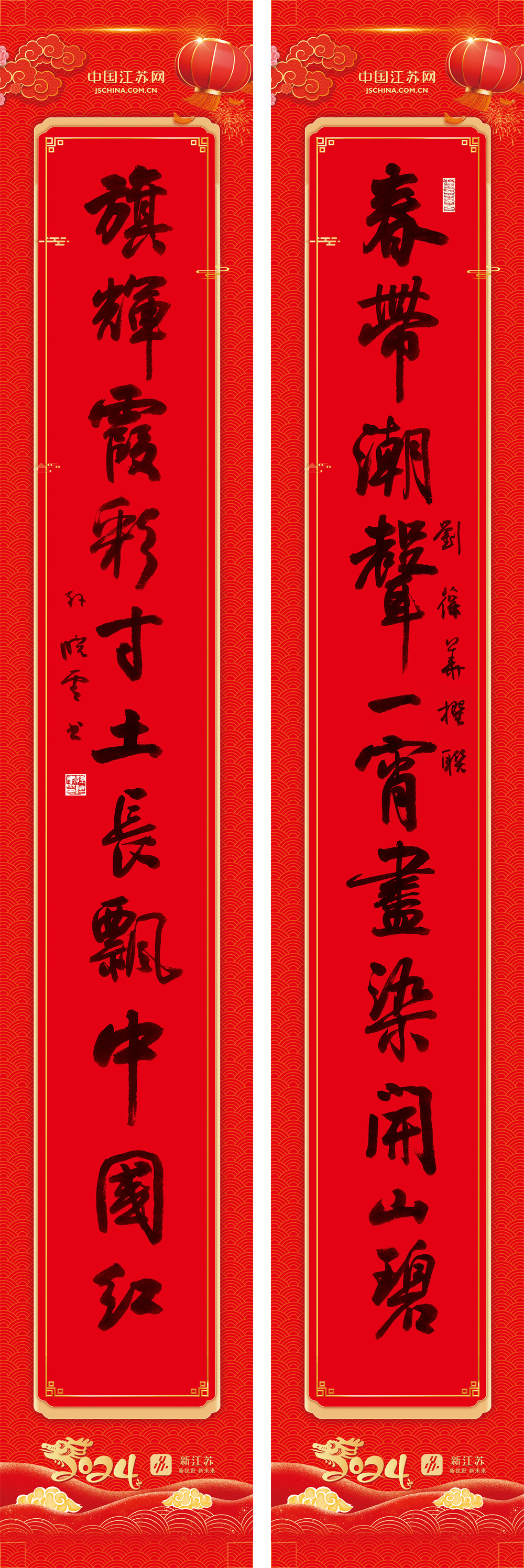 一幅好聯,濃縮歷史、記錄人文,詮釋一個地方的精神風貌。2024年“城門掛春聯 江蘇開門紅”活動組委會收到全國和海外華人一萬多幅作品。王繼才、王仕花守島的故事家喻戶曉,滿滿的家國情懷,給撰聯人廣闊的創作空間,應征作品云集。經過初評、復評、終評和公示,此次灌云開山島的揭聯作品就是從眾多應征作品中脫穎而出、榮獲一等獎的楹聯佳作。撰聯人劉葆華是中國楹聯學會會員、山東省楹聯學會理事,該聯善用色彩對比、力求聲情并茂、遣詞準確傳神,上聯“春帶潮聲,一宵盡染開山碧”繪聲繪色地描寫了眼下開山島展現的新春實景,下聯“旗輝霞彩,寸土長飄中國紅”謳歌了開山島上迎風飄揚的五星紅旗,也隱喻人們要永遠記住、揚起“人民楷模”這面旗幟。短短22個字歌頌了人民楷模王繼才堅守海島、無私奉獻的家國情懷,表達了繼往開來、傳承愛國奉獻精神、實現中國夢的美好憧憬。