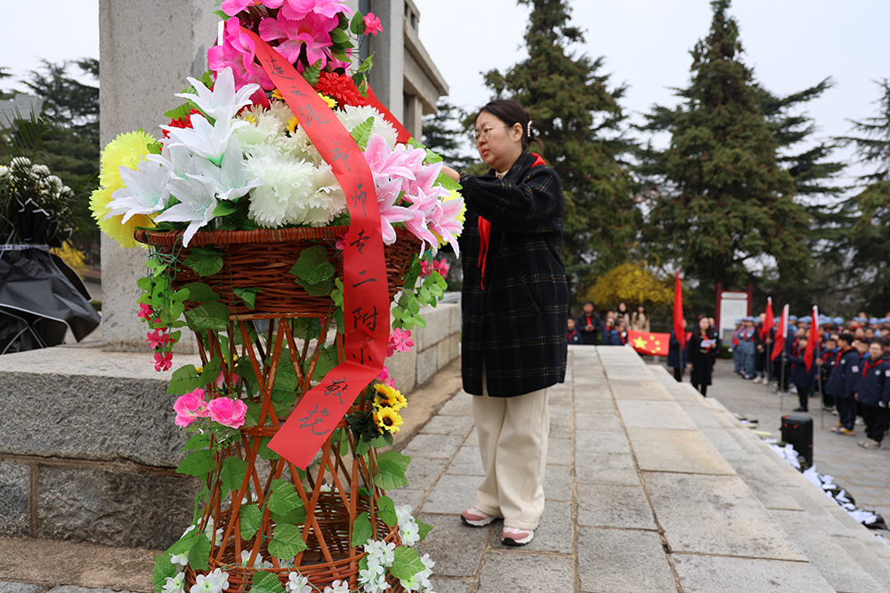 鮮花朵朵,祭奠英魂。學校黨總支副書記、校長胡蕓代表學校黨總支敬獻花籃,整理挽聯(lián)。全體師生向革命烈士紀念碑行三鞠躬禮,表達對烈士的崇高敬意。