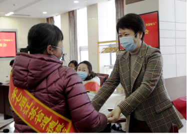 市政府副市長、市文明委副主任王紅紅為江蘇省道德模范提名獎獲得者吳九梅發放慰問金。