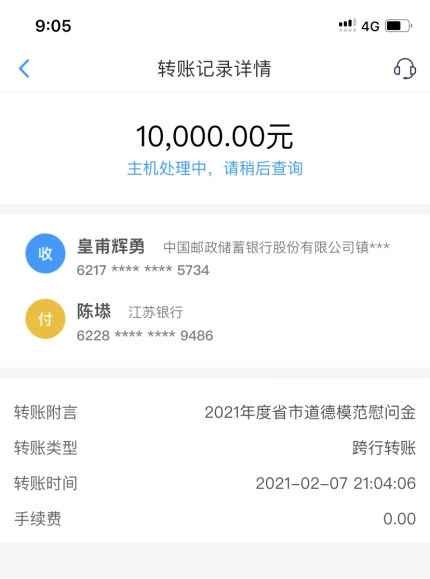 因皇甫輝勇(第四屆全國道德模范)在外市不便回淮,淮陰區文明辦代為轉賬發放慰問金。