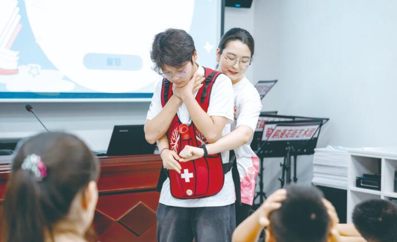 在聚焦生命安全環節,志愿者殷琪跪在墊子上,一邊清晰講解,一邊一步步演示心肺復蘇術的操作方法。孩子們圍成一圈,看得格外認真。9歲的劉雨辰小朋友自告奮勇上前,在殷琪的指導下,小手穩穩地按壓在急救模擬人的胸口,體驗了一次“小小急救員”。緊接著,殷琪和另外一名志愿者合作,生動地展示了海姆立克急救法的操作要點。志愿者還結合暑期特點,為孩子們普及防溺水安全知識,并現場展示急救包內的物品及其使用方法。