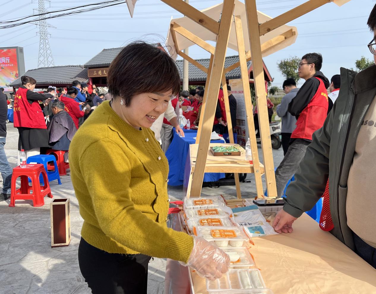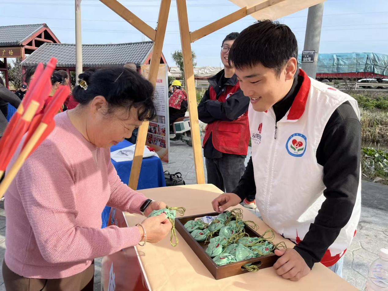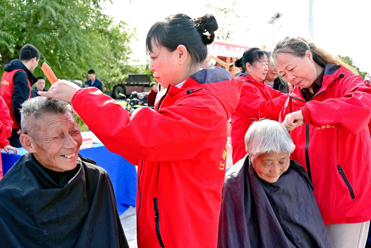 廣場四周,形式多樣的志愿服務攤位構成了一個充滿溫情的“便民集市”。在免費理發攤位前,讓愛啟航公益團隊的志愿者們手中的剪刀上下翻飛,一位位老人片刻間便煥發出清爽的精神面貌;中國移動的志愿者則在耐心輔導老人如何與遠方的兒女視頻通話;傳統文化攤位也吸引了大量群眾參與,體驗重陽節佩戴香囊、品嘗重陽糕等習俗。此外,市中級人民法院、淮安海關、區司法局、區醫保局等單位也分別設立了服務點,為村民提供普法宣傳、衛生知識講解、法律咨詢和醫保政策解讀等服務。 一個個“紅馬甲”穿梭在人群中,成為秋日里最溫暖的風景。