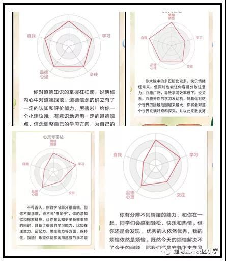 全校師生參加由心理研究領(lǐng)域的專家研發(fā)的微信心理健康自測活動(dòng),圍繞學(xué)習(xí)、交往、情感情緒、自我、品德心理五個(gè)維度,隨機(jī)體驗(yàn)25道心理健康知識題,根據(jù)答題情況,參與者將會(huì)在程序最后看到答題情況的五邊圖,以及一段給出小建議的解讀。
