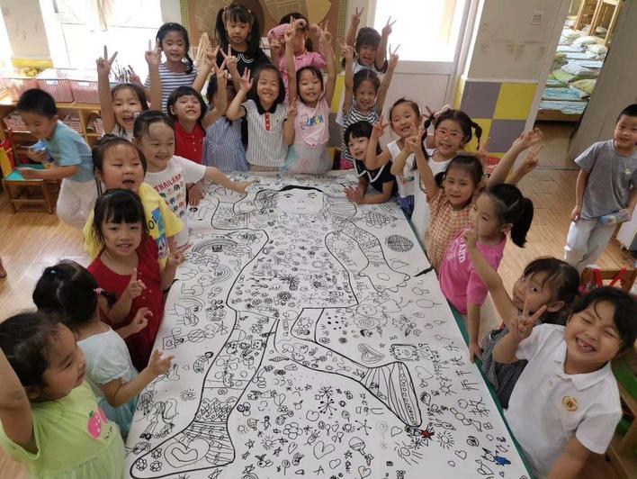 9日,記者在機(jī)關(guān)三幼四季園校區(qū)探訪時(shí)看到,在大(2)班的教室里,成雪瓊、趙雯兩位老師分別躺在長2.4米、寬1.2米的畫卷上,為孩子們做“人體模特”。孩子們則將老師的輪廓描下,再發(fā)揮想象,繪制兩幅人像長卷,作為送給老師的教師節(jié)禮物。