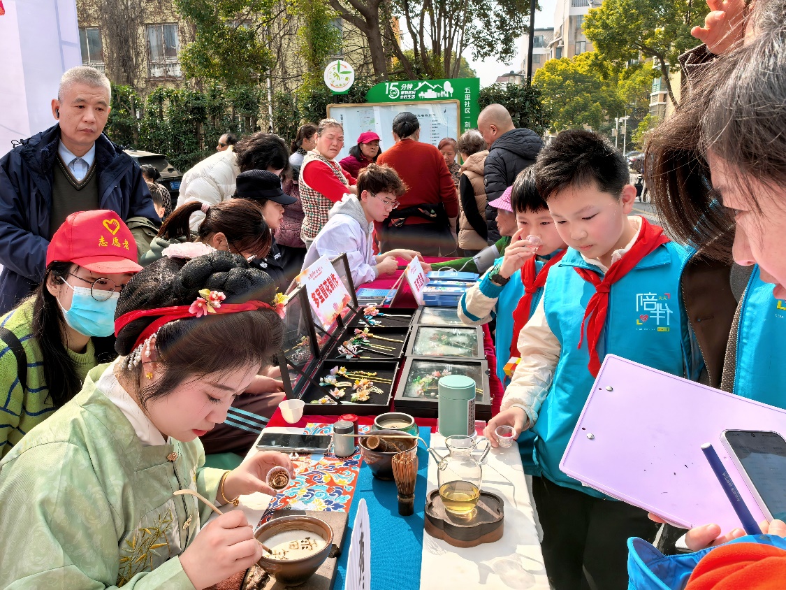 文明集市設有移風易俗、反詐宣傳、書法繪畫圖書義賣、健康知識咨詢、暖心理發、測量血壓、非遺體驗等多個志愿服務攤位。志愿者熱情、耐心地傾聽市民咨詢,為他們及時解答、處理相關問題。豐富的服務內容吸引不少市民前來“趕集”,現場氣氛活躍。