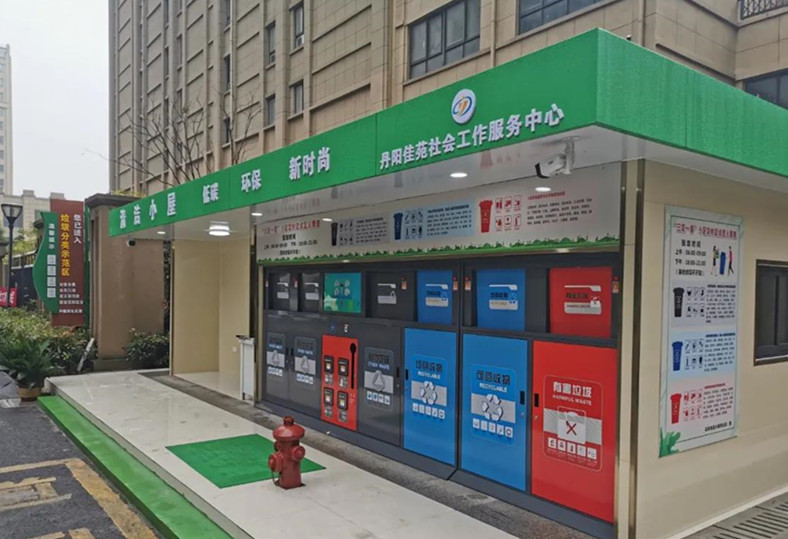 在丹陽城區(qū)的丹金人家小區(qū),一座時尚的智能“清潔小屋”成為風(fēng)景。目前,丹陽市高新區(qū)首批17個試點小區(qū)的31個智能“清潔小屋”已全部建成。這些智能“清潔小屋”有15-30平方米,大小不等,功能齊全,設(shè)置了可回收箱、有害箱、廚余箱、其他箱,采用封閉式設(shè)計。屋內(nèi)配置了空調(diào)、監(jiān)控、除臭、滅蠅除蚊、垃圾桶清洗、污水排放等多種裝置和系統(tǒng),附近還配置了“自動售貨機”,居民可用垃圾分類所得積分直接兌換里面的生活用品。根據(jù)要求,每天垃圾投放時間分別為6時到9時、18時到21時。