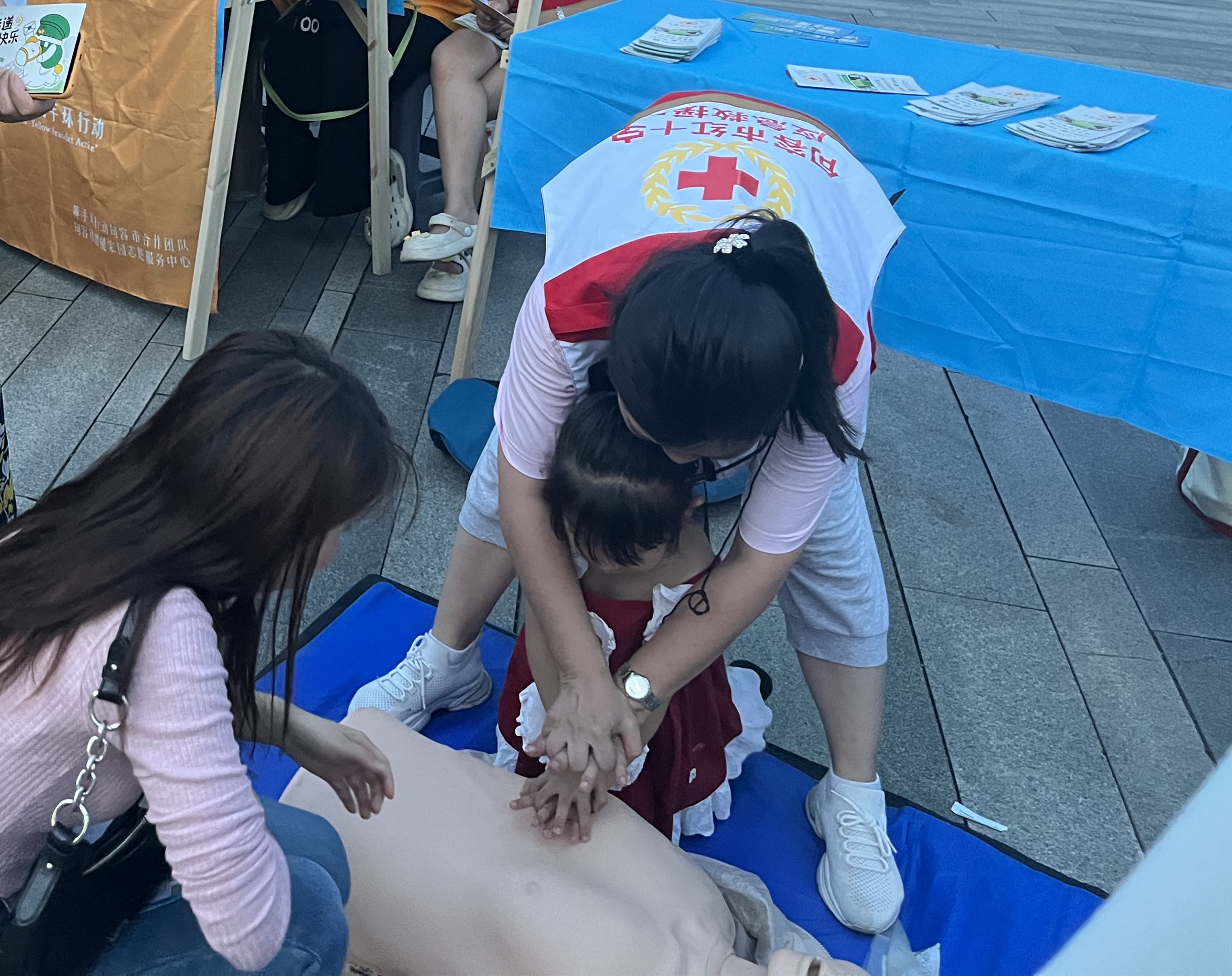 在非遺夜市一側,文明集市同步出攤。微能家園志愿服務中心、“點點微光”禁毒宣傳志愿服務隊、句容市紅十字應急救護培訓志愿服務隊等9支志愿服務隊,現(xiàn)場開展關愛老年人“黃手環(huán)行動”、禁毒宣傳、紅十字應急救護宣傳培訓等志愿活動,吸引了眾多市民的目光。“他們講解得很細致,并且手把手進行指導,讓我掌握了一項很重要的急救技能。”句容市民王蕓在句容市紅十字應急救護培訓志愿服務隊隊員的指導下,現(xiàn)場學習了心肺復蘇操作步驟。