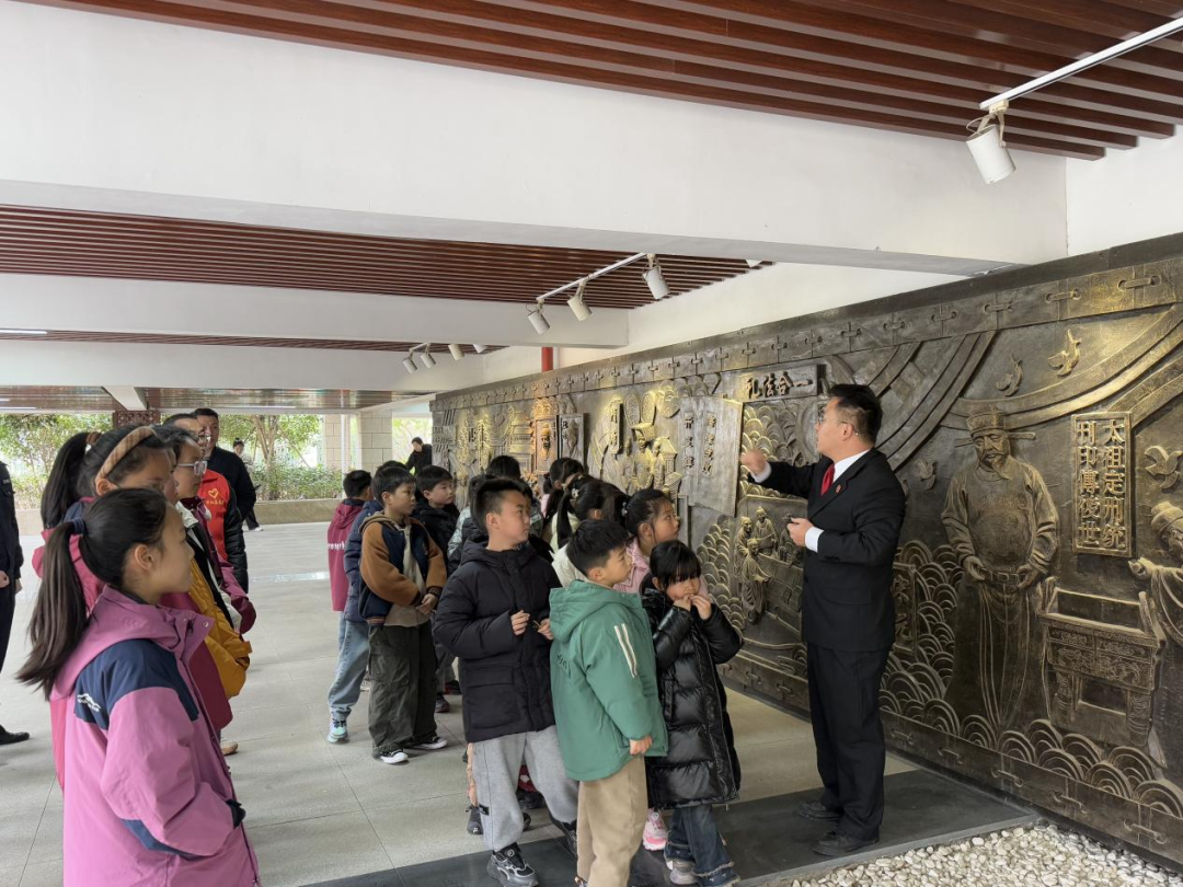 在郭莊派出所民警與白兔法庭法官的引導下,學生們參觀了法庭法治文化設施。在法治廣場,法官結合鐫刻“依法治國”“以德治國”的石碑,闡釋法律與道德對社會治理的重要性;在法治浮雕墻前,他通過法鼎、法槌等圖案串聯古今法律歷史,強調法治文明的傳承意義;步入法治文化長廊,學生們通過“法治和諧”“公平正義”主題展板,系統了解法治對社會的基礎性作用。
