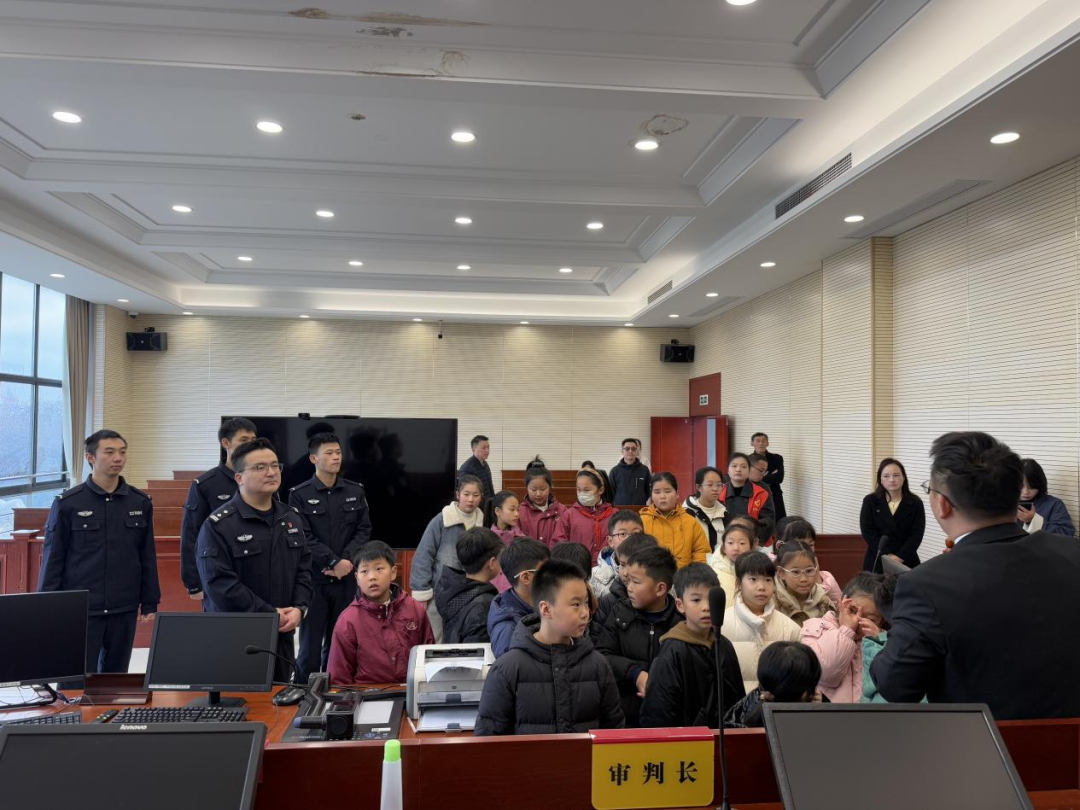 隨后,法官在審判庭內向學生講解法庭職能及審判流程,重點說明審判長、審判員、書記員的職責分工,以及原、被告的訴訟權利。結合校園安全案例,郭莊派出所民警補充強調守法意識的重要性,并提醒學生“法律是維護權益的保障”。