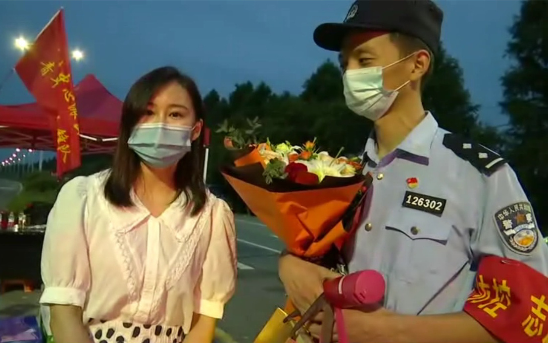 在231省道興化中堡防控卡口,興化市公安局牌樓中心派出所青年民警王新浩正在卡口執勤,妻子朱彤給他送來一束鮮花和愛心便當,這是妻子精心準備的七夕節禮物。朱彤是中醫院的護士,她深知丈夫在防控一線的辛勞?!巴昶呦?,老公都是和我一起看場電影,今年因為疫情防控,他在卡口執勤,我來這里陪他一起過,堅守平安是我們共同的心愿,揚州加油!”朱彤舉起拳頭。