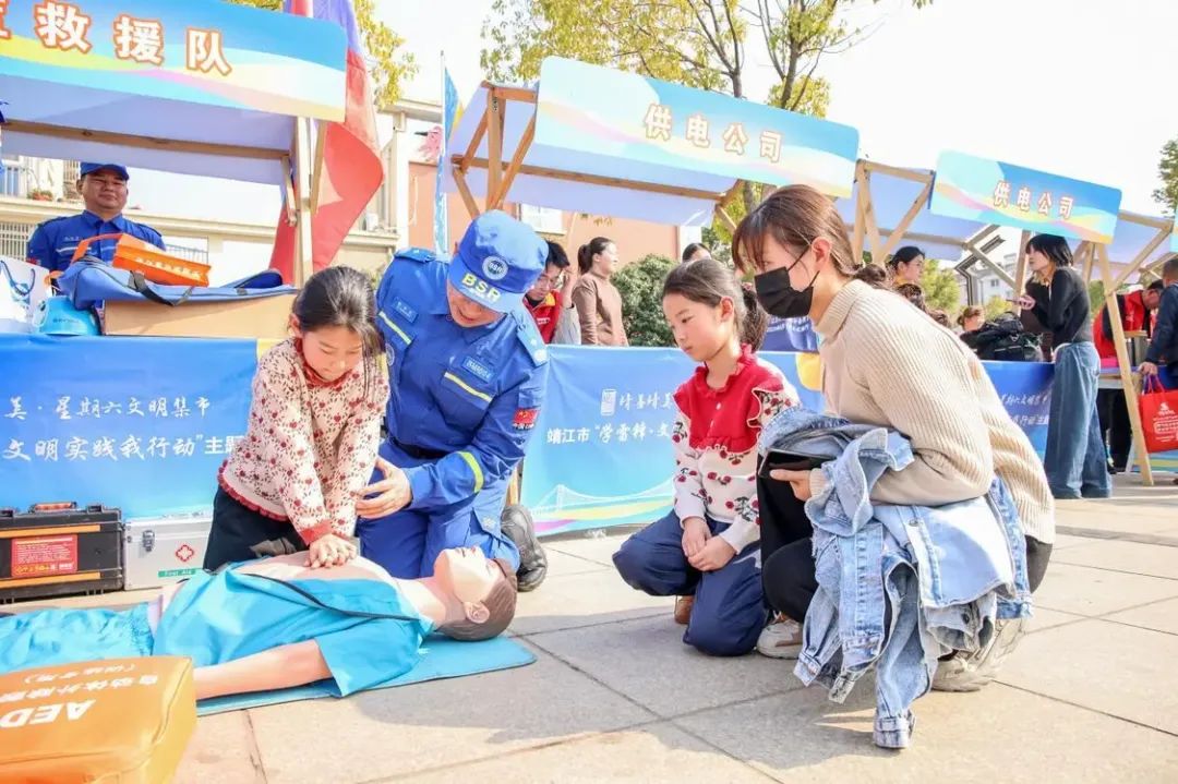 應急救護培訓展位前,市民在專業救護人員的指導下,學習心肺復蘇的正確方式;市人社局除了宣傳就業、社保政策外,還聯合江陰-靖江工業園區組織企業現場招聘,將130余個崗位送到群眾“家門口”;市文明辦志愿者現場向居民們發放《泰州市文明行為條例10問》《圖說靖江文明16條》等宣傳折頁,宣傳文明禮儀、文明上網、文明養寵等相關知識;社區青少年積極參與“微光義賣”活動,拿出閑置的圖書、玩具現場義賣,為困境兒童籌集善款。