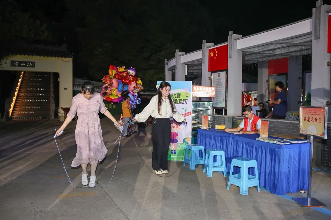 健康運動區,醫護人員為老人測量血壓并發放秋季養生食譜,跳繩PK賽的歡笑聲此起彼伏。